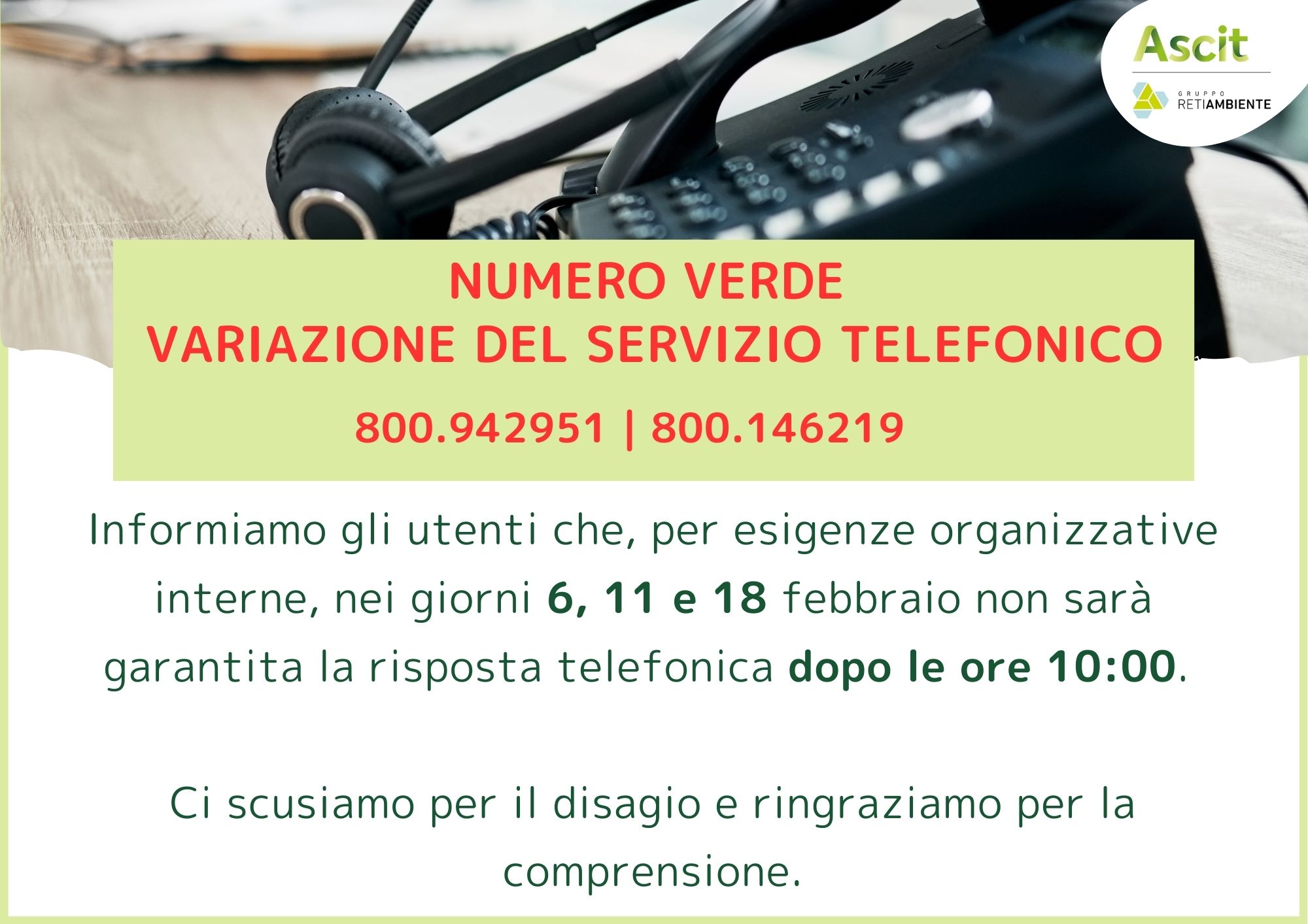 ContinuaAl fine di realizzare un’indagine di customer satisfaction, gli utenti potrebbero essere contattati telefonicamente dall’Autorità d’Ambito (o soggetto delegato) per alcune domande sul gradimento del servizio erogato. L’Autorità d’Ambito (o soggetto delegato) adopererà i dati esclusivamente ai fini dell’indagine, senza possibilità di cessione a terze parti”. Ascit servizi ambientali SpA e RetiAmbiente ringraziano per la […]
