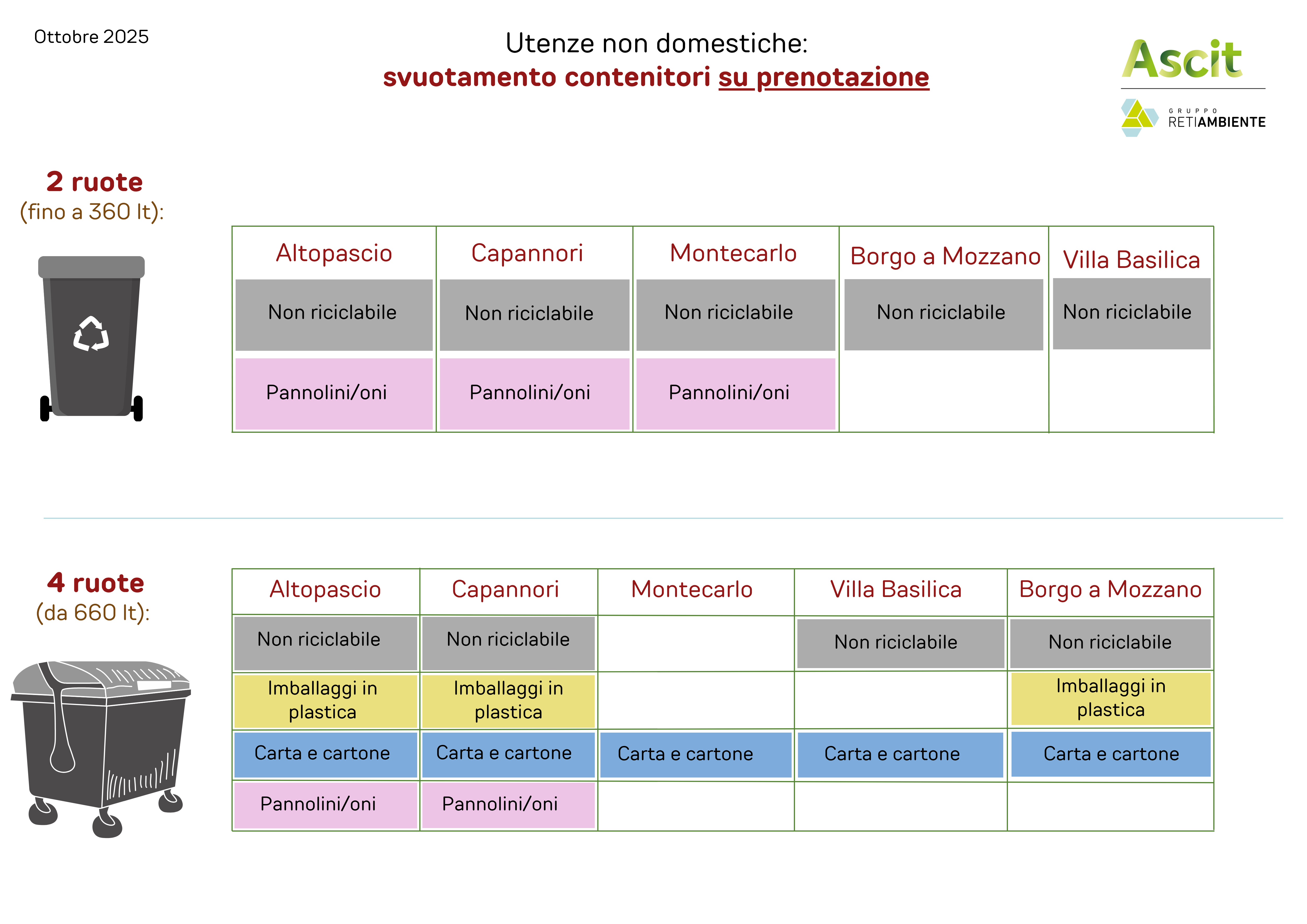 Per le Utenze non domestiche di Altopascio, Capannori, Montecarlo,Villa Basilica e Borgo a Mozzano, Ascit organizza la raccolta, su prenotazione, di alcune tipologie di rifiuti urbani (in orario continuato 06:00 – 18:00), in base al contenitore carrellato che l’utente possiede. Scopri quali ritiri puoi richiedere: