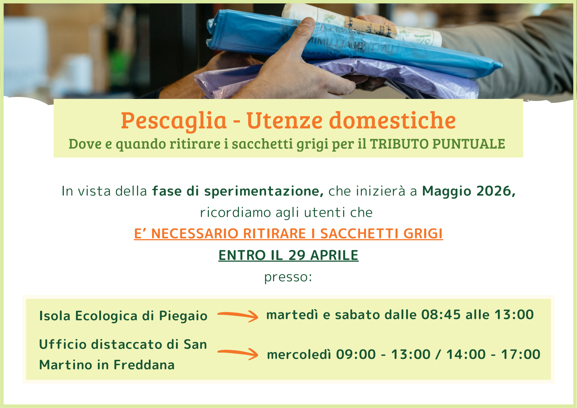 ContinuaDa mercoledì 01/09/2021 al giorno 31/12/2021 in via sperimentale gli utenti di Borgo a Mozzano potranno usufruire del Centro di Raccolta di Piegaio (Comune di Pescaglia) per conferire i materiali . Presso il CDR di Piegaio potranno essere conferiti materiali in conformità a quanto autorizzato sul CDR stesso: per maggiori informazione consultare il Sito nella […]